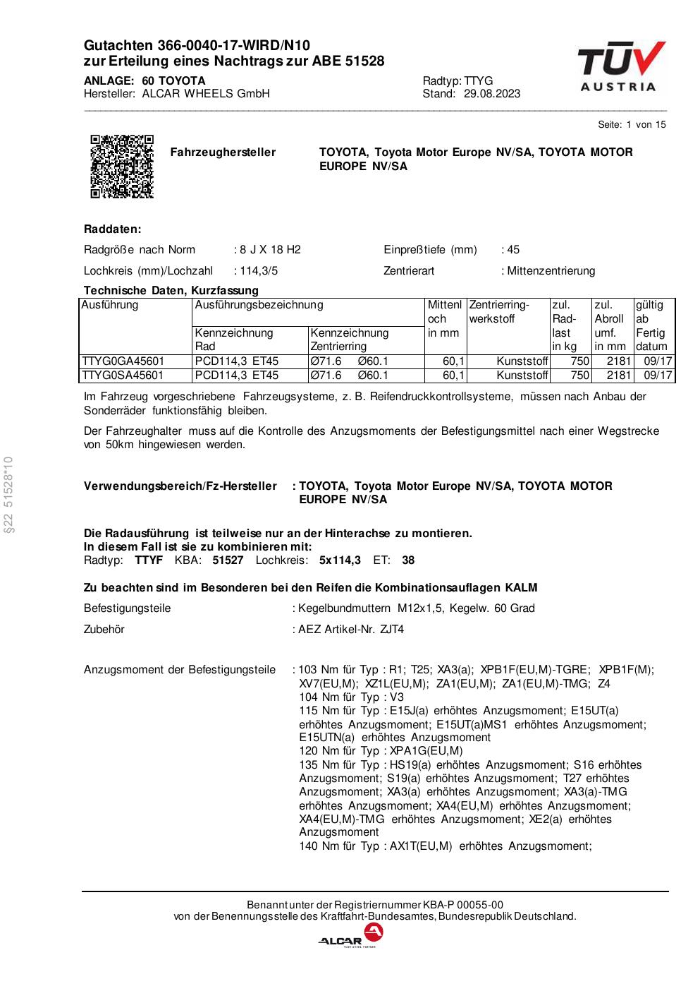 Dieses Gutachten (abe) bezieht sich auf die Alufelge alcar TTYG in der Ausführung 8Jx18 ET 0, Mittenloch 0 mm (KBA 51528). Im PDF findest du typischerweise zulässige Reifengrößen, Auflagen/Anbauhinweise und – je nach Dokument – Hinweise zur Eintragung.