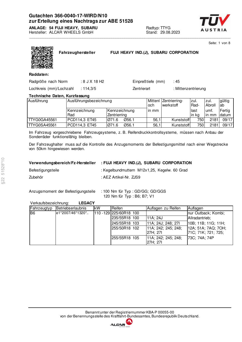 Dieses Gutachten (abe) bezieht sich auf die Alufelge alcar TTYG in der Ausführung 8Jx18 ET 0, Mittenloch 0 mm (KBA 51528). Im PDF findest du typischerweise zulässige Reifengrößen, Auflagen/Anbauhinweise und – je nach Dokument – Hinweise zur Eintragung.