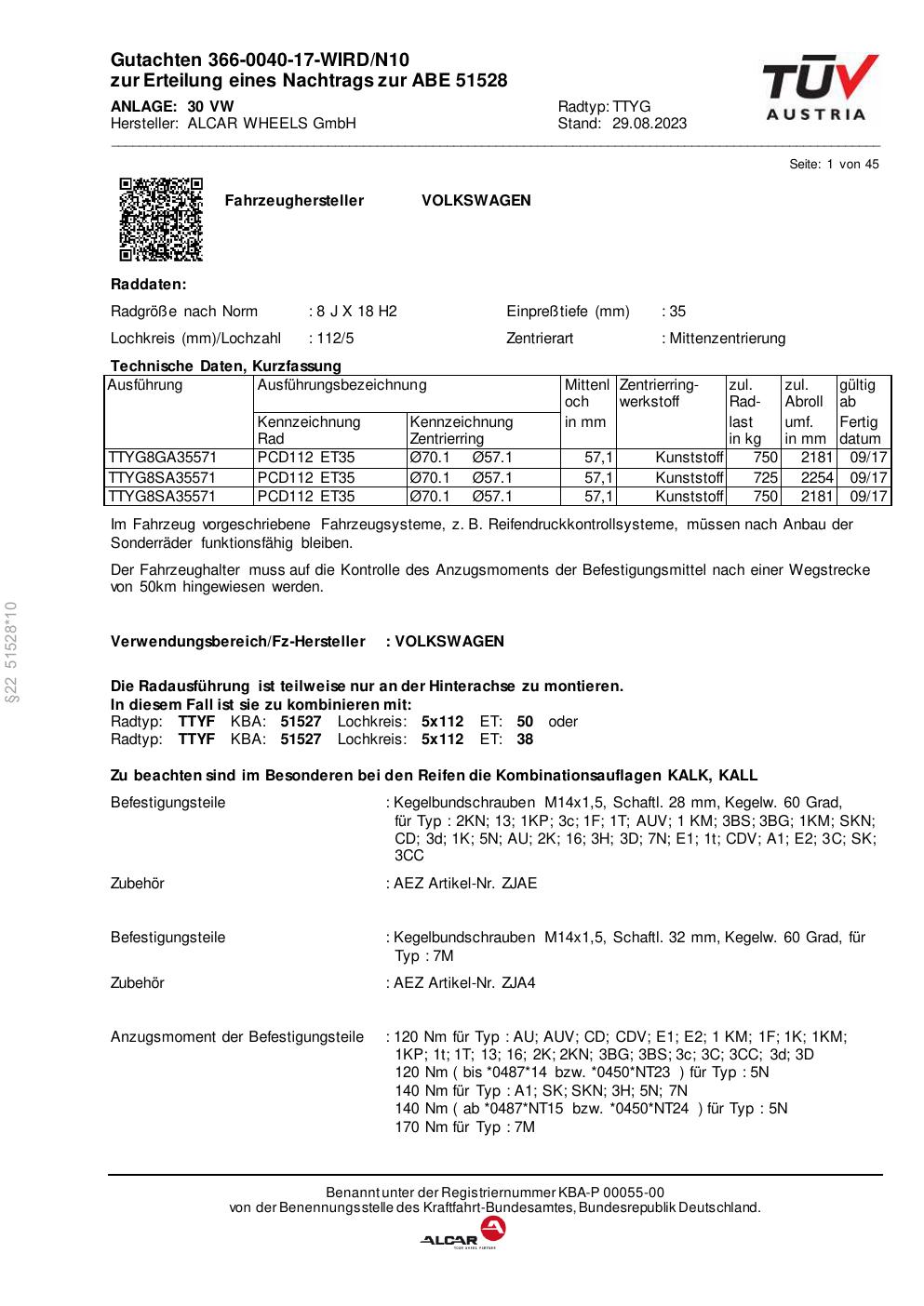 Dieses Gutachten (abe) bezieht sich auf die Alufelge alcar TTYG in der Ausführung 8Jx18 ET 0, Mittenloch 0 mm (KBA 51528). Im PDF findest du typischerweise zulässige Reifengrößen, Auflagen/Anbauhinweise und – je nach Dokument – Hinweise zur Eintragung.