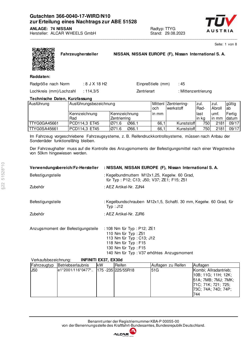 Dieses Gutachten (abe) bezieht sich auf die Alufelge alcar TTYG in der Ausführung 8Jx18 ET 0, Mittenloch 0 mm (KBA 51528). Im PDF findest du typischerweise zulässige Reifengrößen, Auflagen/Anbauhinweise und – je nach Dokument – Hinweise zur Eintragung.