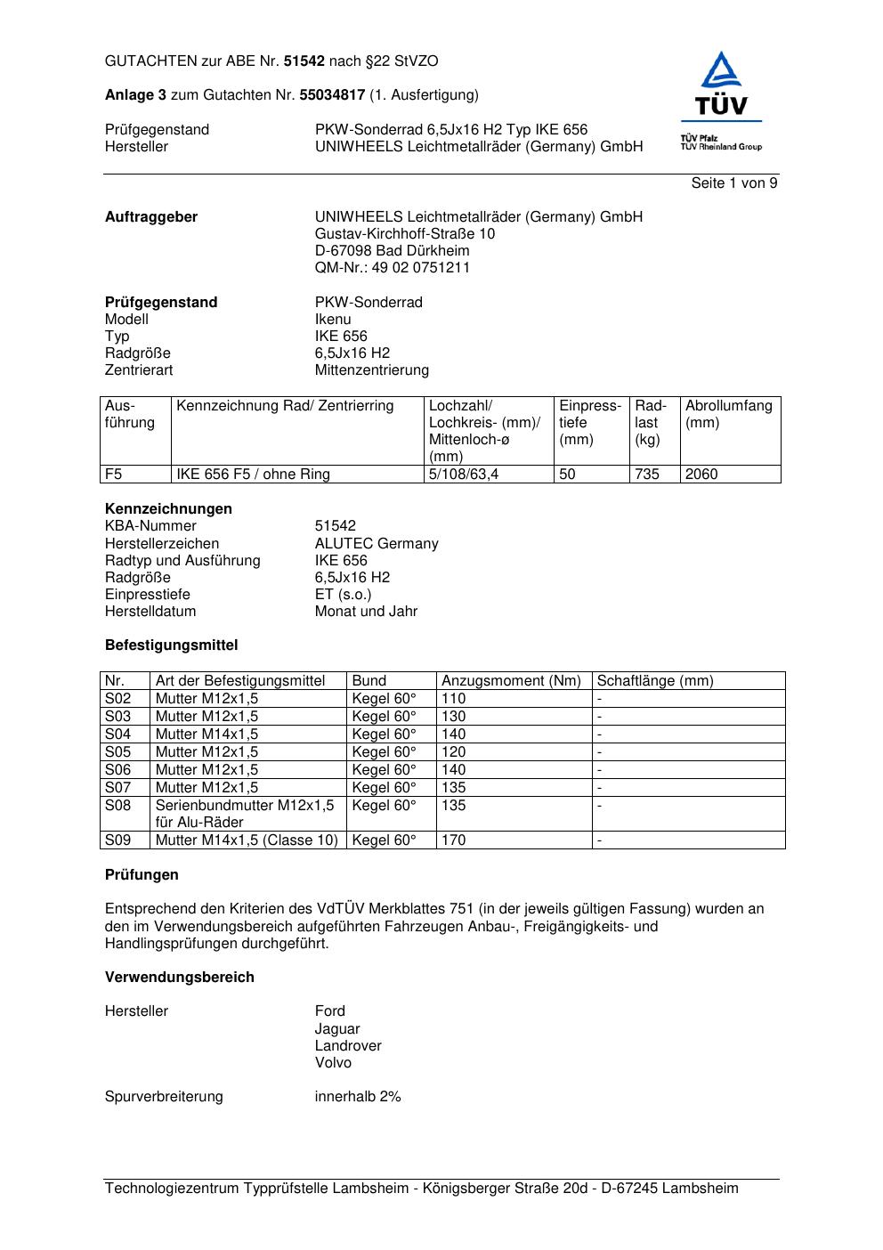 Dieses Gutachten (abe) bezieht sich auf die Alufelge ALUTEC IKE 656 in der Ausführung 6.5Jx16 ET 0, Mittenloch 0 mm (KBA 51542). Im PDF findest du typischerweise zulässige Reifengrößen, Auflagen/Anbauhinweise und – je nach Dokument – Hinweise zur Eintragung.