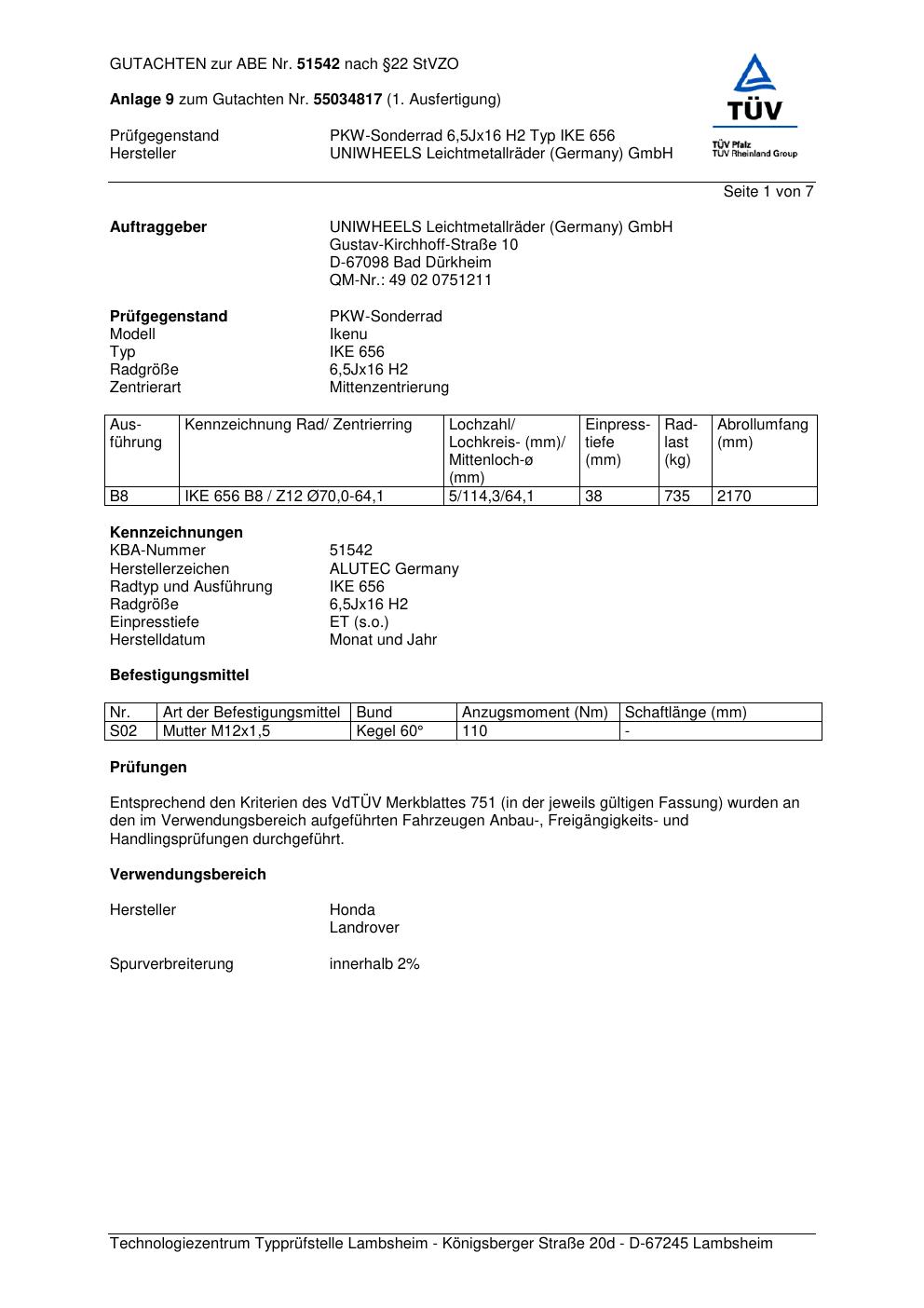 Dieses Gutachten (abe) bezieht sich auf die Alufelge ALUTEC IKE 656 in der Ausführung 6.5Jx16 ET 0, Mittenloch 0 mm (KBA 51542). Im PDF findest du typischerweise zulässige Reifengrößen, Auflagen/Anbauhinweise und – je nach Dokument – Hinweise zur Eintragung.