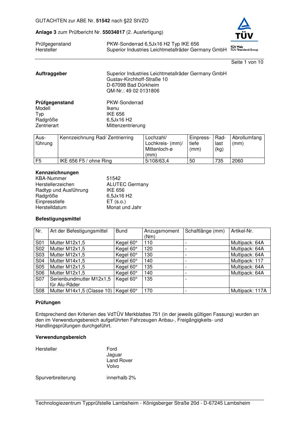 Dieses Gutachten (abe) bezieht sich auf die Alufelge ALUTEC IKE 656 in der Ausführung 6.5Jx16 ET 0, Mittenloch 0 mm (KBA 51542). Im PDF findest du typischerweise zulässige Reifengrößen, Auflagen/Anbauhinweise und – je nach Dokument – Hinweise zur Eintragung.