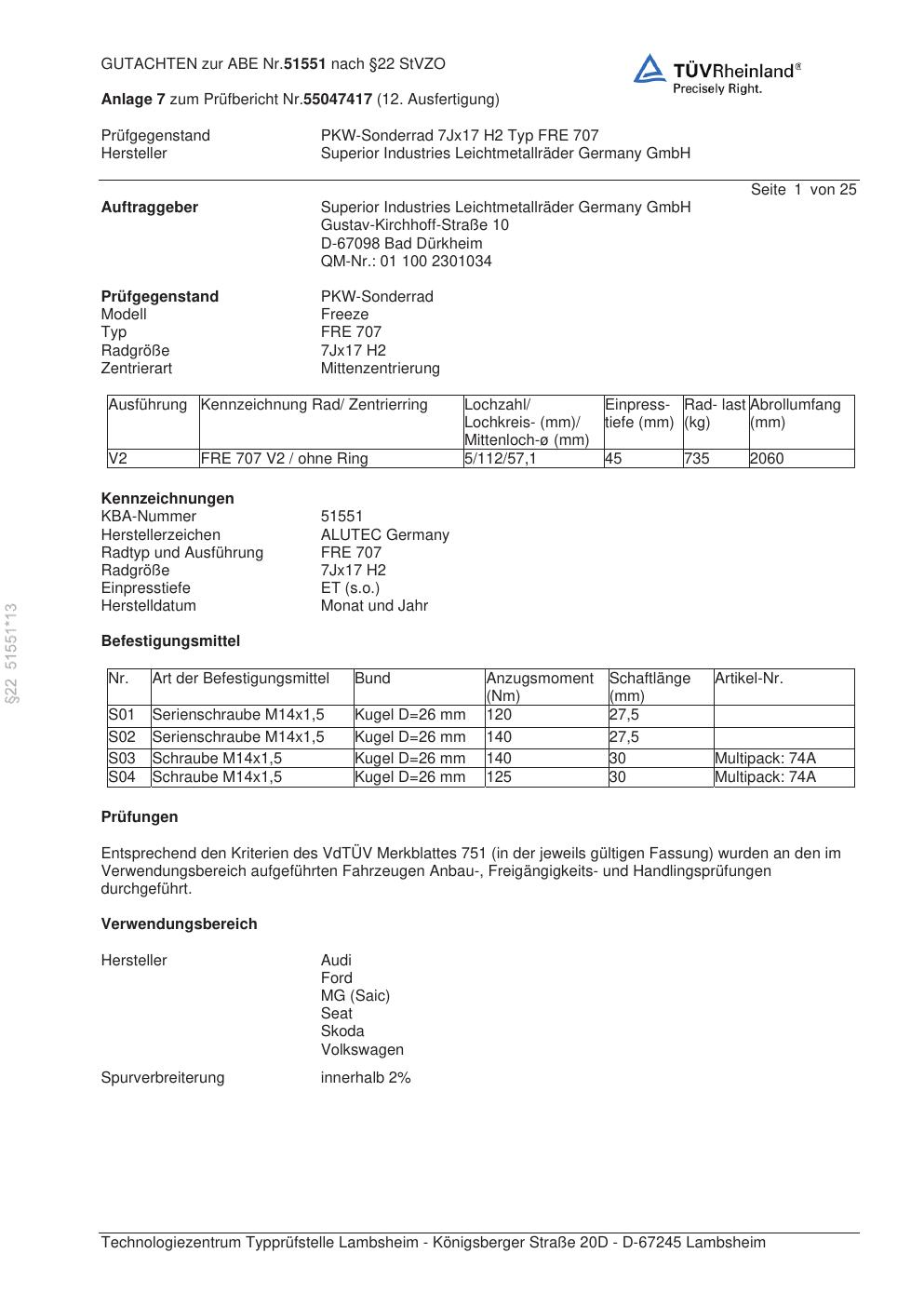 Dieses Gutachten (abe) bezieht sich auf die Alufelge ALUTEC FRE 707 in der Ausführung 7Jx17 ET 0, Mittenloch 0 mm (KBA 51551). Im PDF findest du typischerweise zulässige Reifengrößen, Auflagen/Anbauhinweise und – je nach Dokument – Hinweise zur Eintragung.