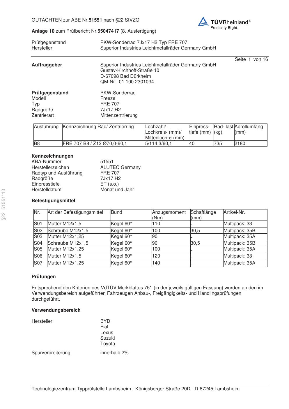 Dieses Gutachten (abe) bezieht sich auf die Alufelge ALUTEC FRE 707 in der Ausführung 7Jx17 ET 0, Mittenloch 0 mm (KBA 51551). Im PDF findest du typischerweise zulässige Reifengrößen, Auflagen/Anbauhinweise und – je nach Dokument – Hinweise zur Eintragung.
