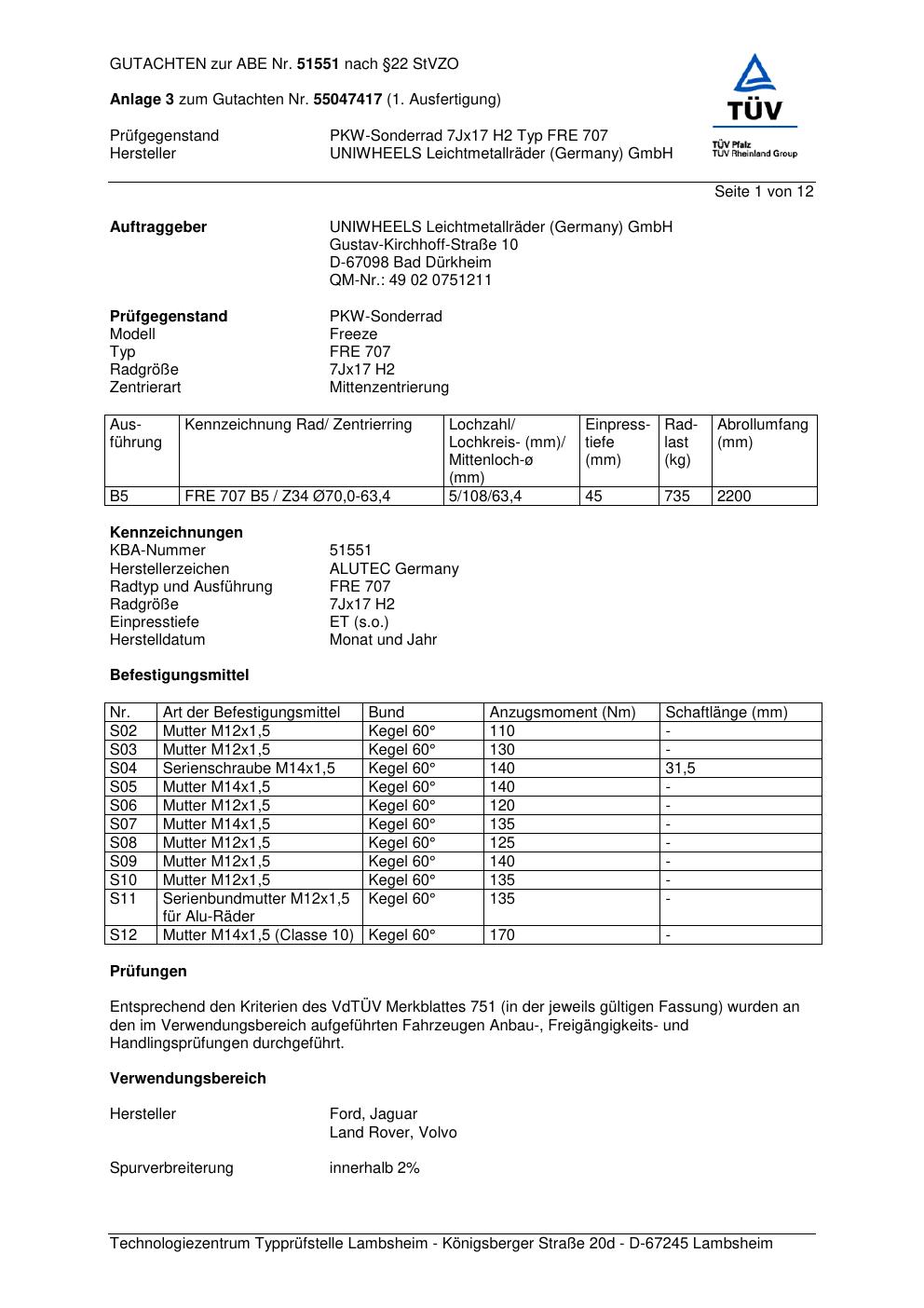 Dieses Gutachten (abe) bezieht sich auf die Alufelge ALUTEC FRE 707 in der Ausführung 7Jx17 ET 0, Mittenloch 0 mm (KBA 51551). Im PDF findest du typischerweise zulässige Reifengrößen, Auflagen/Anbauhinweise und – je nach Dokument – Hinweise zur Eintragung.