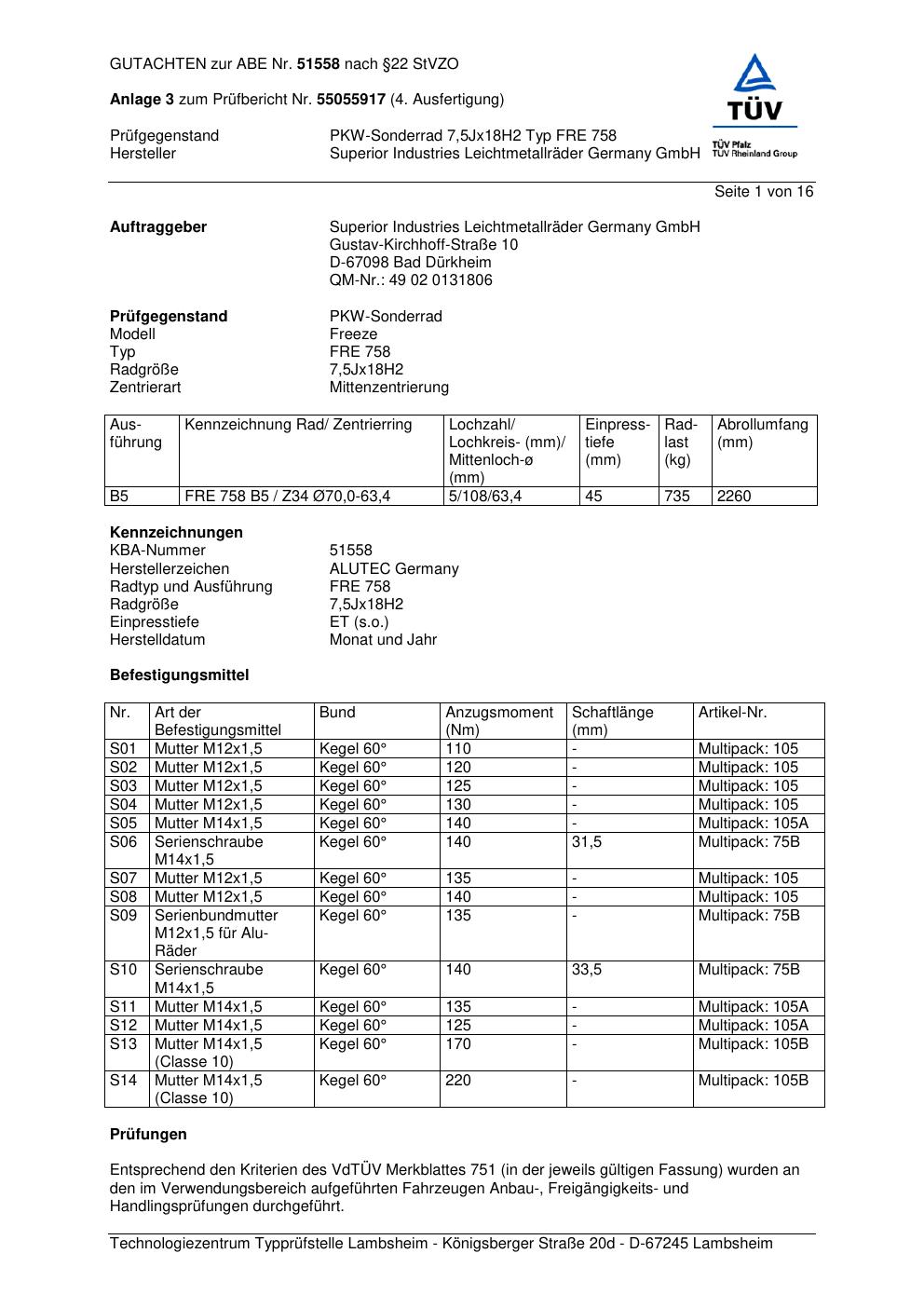 Dieses Gutachten (abe) bezieht sich auf die Alufelge ALUTEC FRE 758 in der Ausführung 7.5Jx18 ET 0, Mittenloch 0 mm (KBA 51558). Im PDF findest du typischerweise zulässige Reifengrößen, Auflagen/Anbauhinweise und – je nach Dokument – Hinweise zur Eintragung.