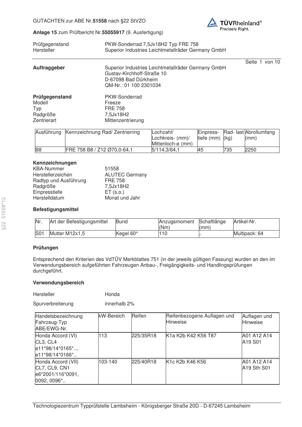 Dieses Gutachten (abe) bezieht sich auf die Alufelge ALUTEC FRE 758 in der Ausführung 7.5Jx18 ET 0, Mittenloch 0 mm (KBA 51558). Im PDF findest du typischerweise zulässige Reifengrößen, Auflagen/Anbauhinweise und – je nach Dokument – Hinweise zur Eintragung.
