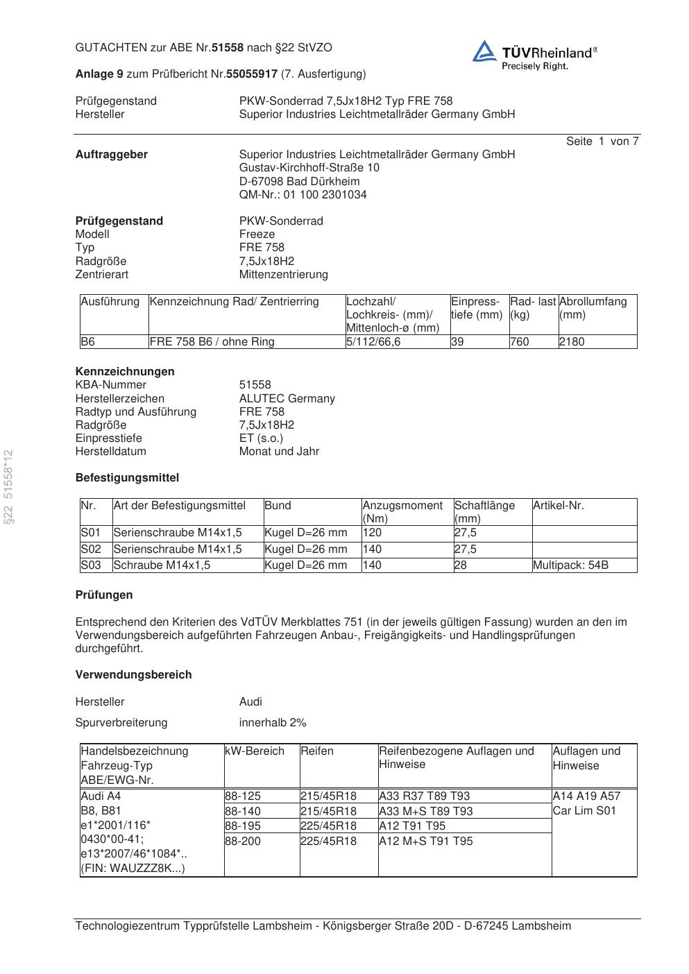 Dieses Gutachten (abe) bezieht sich auf die Alufelge ALUTEC FRE 758 in der Ausführung 7.5Jx18 ET 0, Mittenloch 0 mm (KBA 51558). Im PDF findest du typischerweise zulässige Reifengrößen, Auflagen/Anbauhinweise und – je nach Dokument – Hinweise zur Eintragung.
