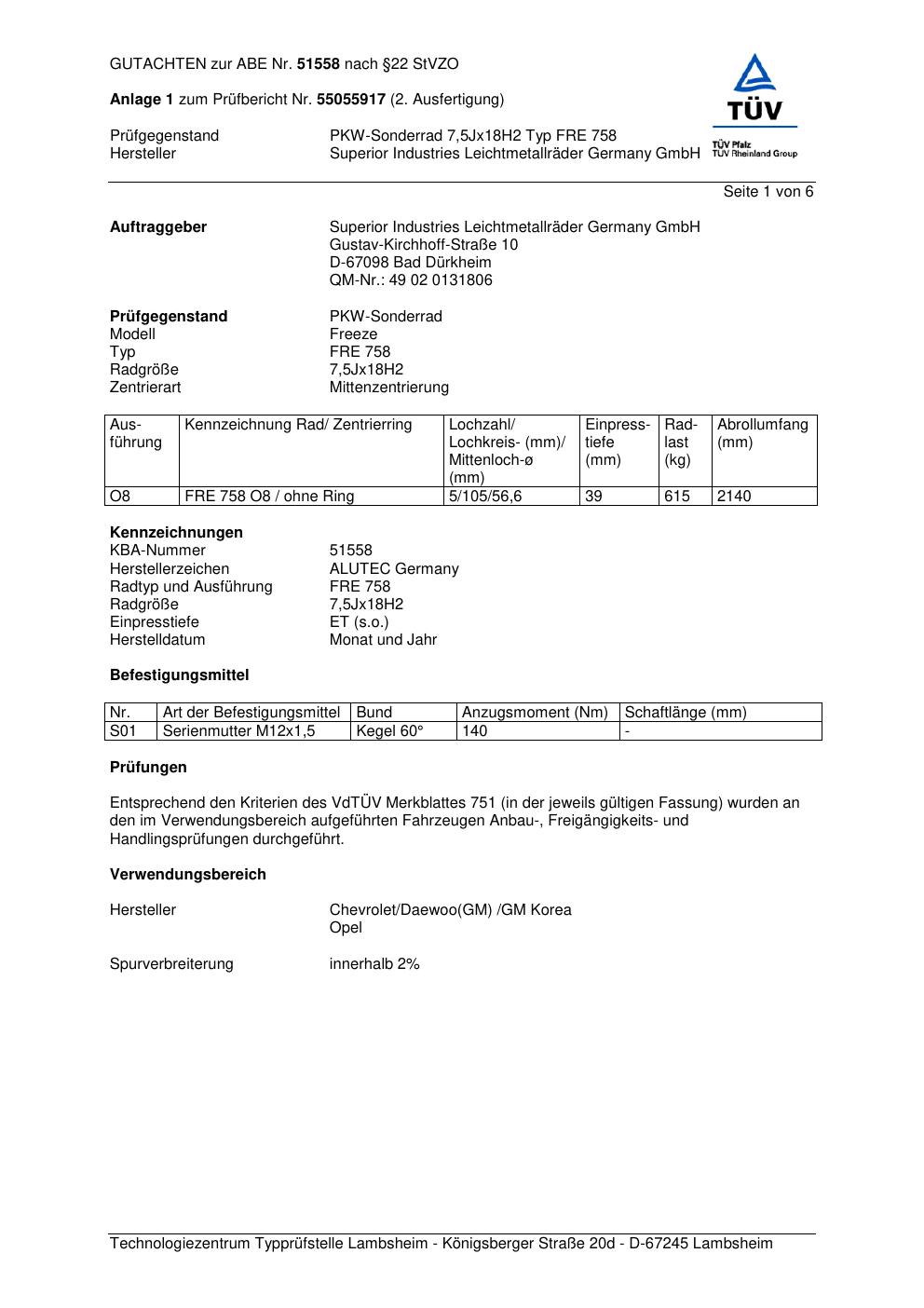 Dieses Gutachten (abe) bezieht sich auf die Alufelge ALUTEC FRE 758 in der Ausführung 7.5Jx18 ET 0, Mittenloch 0 mm (KBA 51558). Im PDF findest du typischerweise zulässige Reifengrößen, Auflagen/Anbauhinweise und – je nach Dokument – Hinweise zur Eintragung.