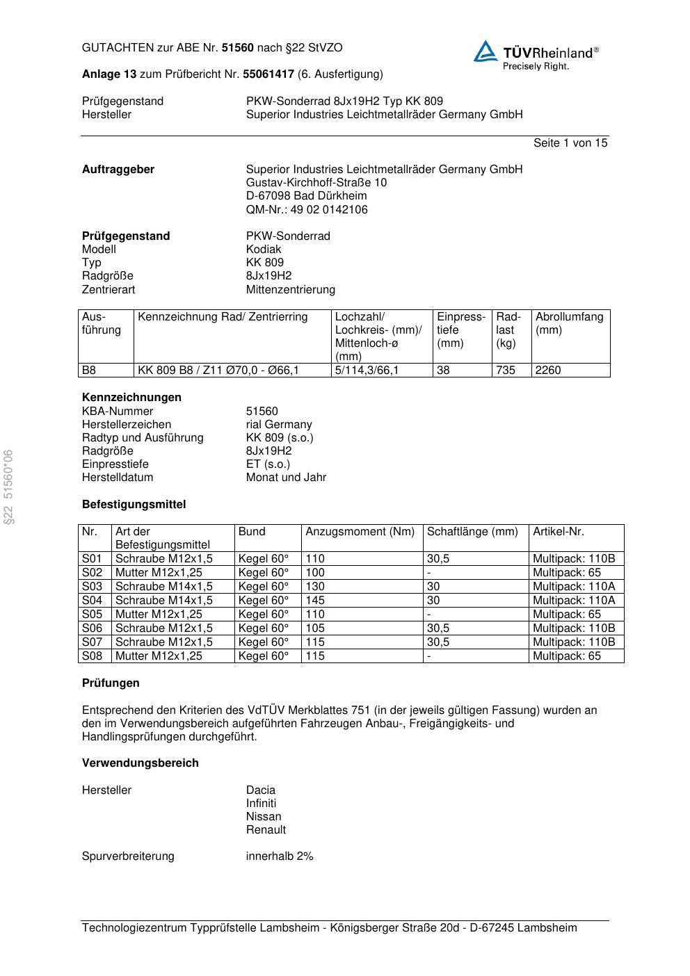 Dieses Gutachten (abe) bezieht sich auf die Alufelge brand-rial KK 809 in der Ausführung 8Jx19 ET 0, Mittenloch 0 mm (KBA 51560). Im PDF findest du typischerweise zulässige Reifengrößen, Auflagen/Anbauhinweise und – je nach Dokument – Hinweise zur Eintragung.