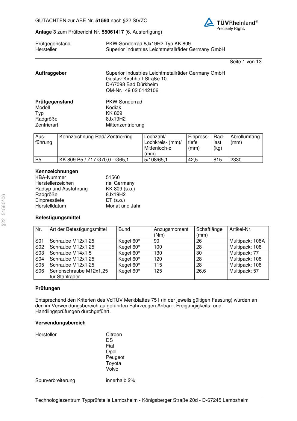 Dieses Gutachten (abe) bezieht sich auf die Alufelge brand-rial KK 809 in der Ausführung 8Jx19 ET 0, Mittenloch 0 mm (KBA 51560). Im PDF findest du typischerweise zulässige Reifengrößen, Auflagen/Anbauhinweise und – je nach Dokument – Hinweise zur Eintragung.