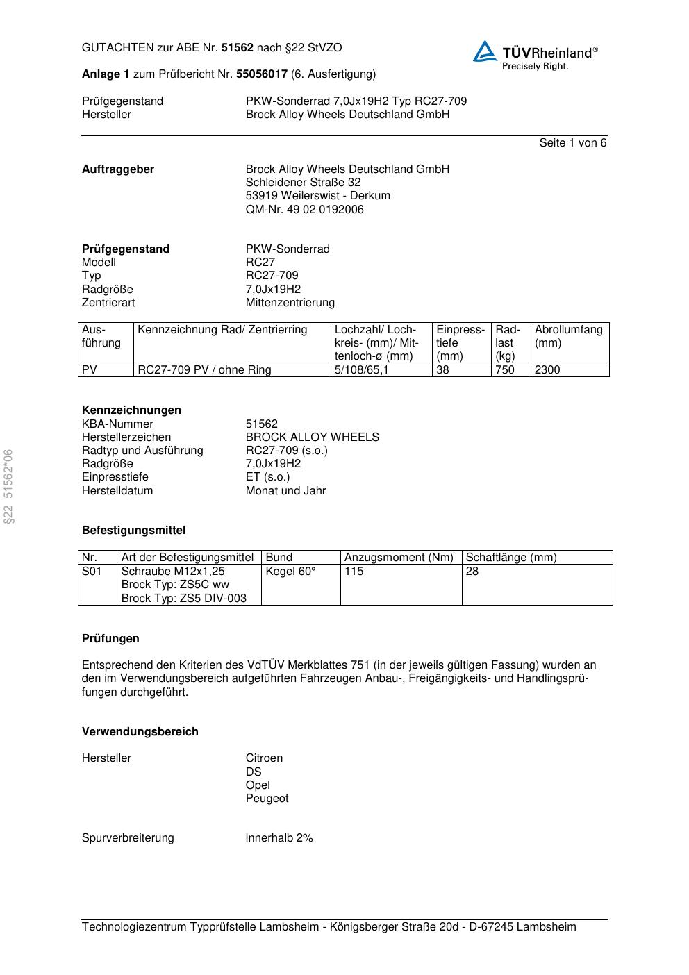 Dieses Gutachten (abe) bezieht sich auf die Alufelge Brock RC27-709 in der Ausführung 7Jx19 ET 0, Mittenloch 0 mm (KBA 51562). Im PDF findest du typischerweise zulässige Reifengrößen, Auflagen/Anbauhinweise und – je nach Dokument – Hinweise zur Eintragung.