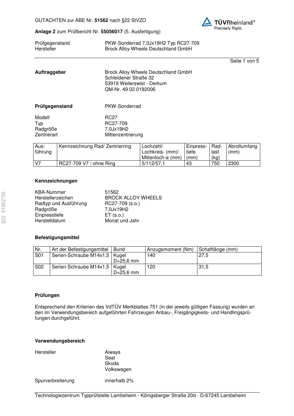 Dieses Gutachten (abe) bezieht sich auf die Alufelge Brock RC27-709 in der Ausführung 7Jx19 ET 0, Mittenloch 0 mm (KBA 51562). Im PDF findest du typischerweise zulässige Reifengrößen, Auflagen/Anbauhinweise und – je nach Dokument – Hinweise zur Eintragung.