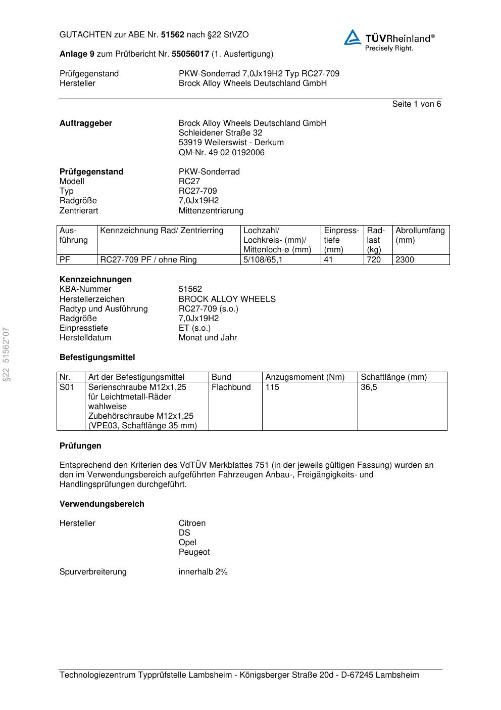 Dieses Gutachten (abe) bezieht sich auf die Alufelge Brock RC27-709 in der Ausführung 7Jx19 ET 0, Mittenloch 0 mm (KBA 51562). Im PDF findest du typischerweise zulässige Reifengrößen, Auflagen/Anbauhinweise und – je nach Dokument – Hinweise zur Eintragung.