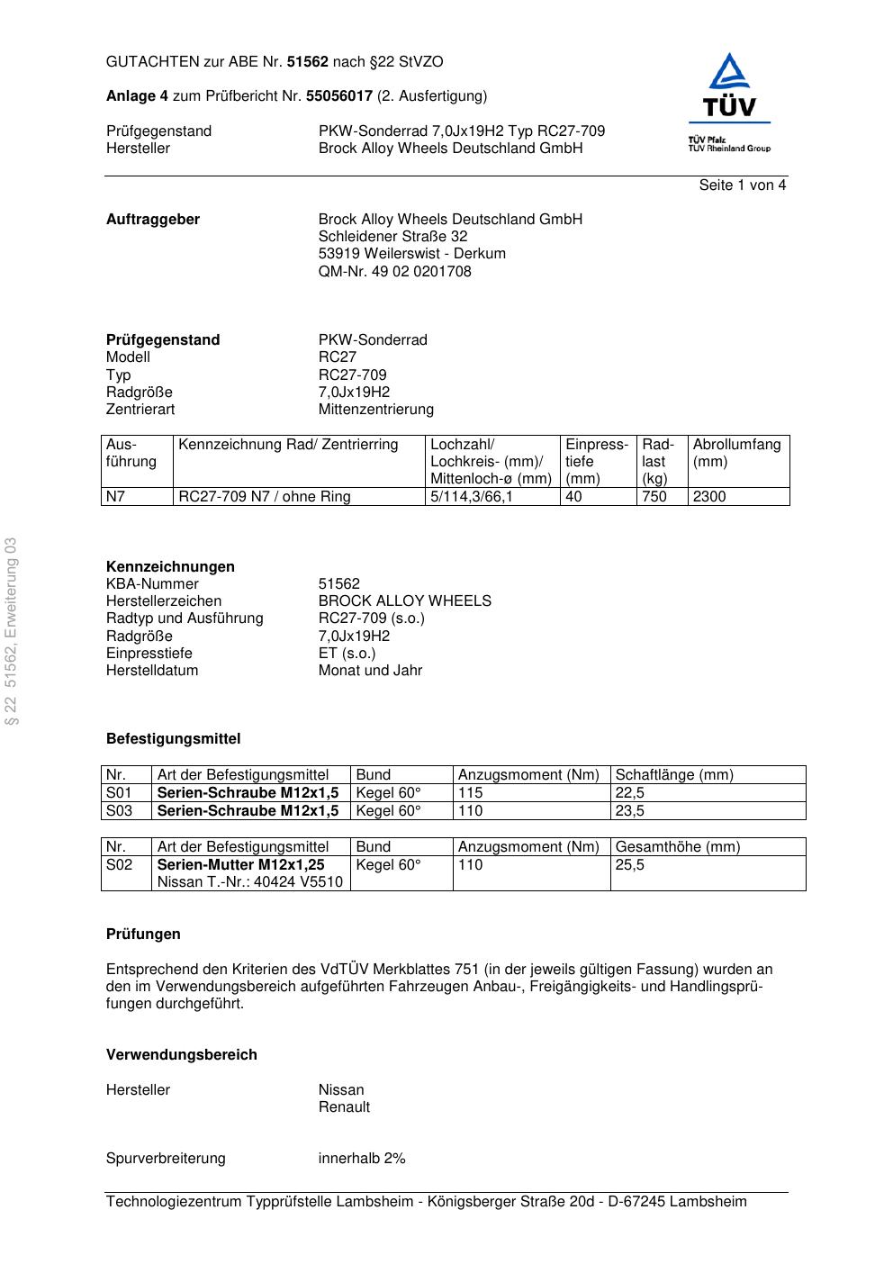 Dieses Gutachten (abe) bezieht sich auf die Alufelge Brock RC27-709 in der Ausführung 7Jx19 ET 0, Mittenloch 0 mm (KBA 51562). Im PDF findest du typischerweise zulässige Reifengrößen, Auflagen/Anbauhinweise und – je nach Dokument – Hinweise zur Eintragung.
