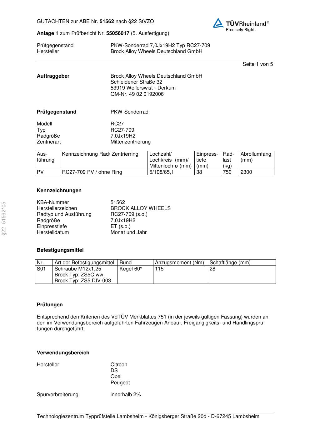 Dieses Gutachten (abe) bezieht sich auf die Alufelge Brock RC27-709 in der Ausführung 7Jx19 ET 0, Mittenloch 0 mm (KBA 51562). Im PDF findest du typischerweise zulässige Reifengrößen, Auflagen/Anbauhinweise und – je nach Dokument – Hinweise zur Eintragung.