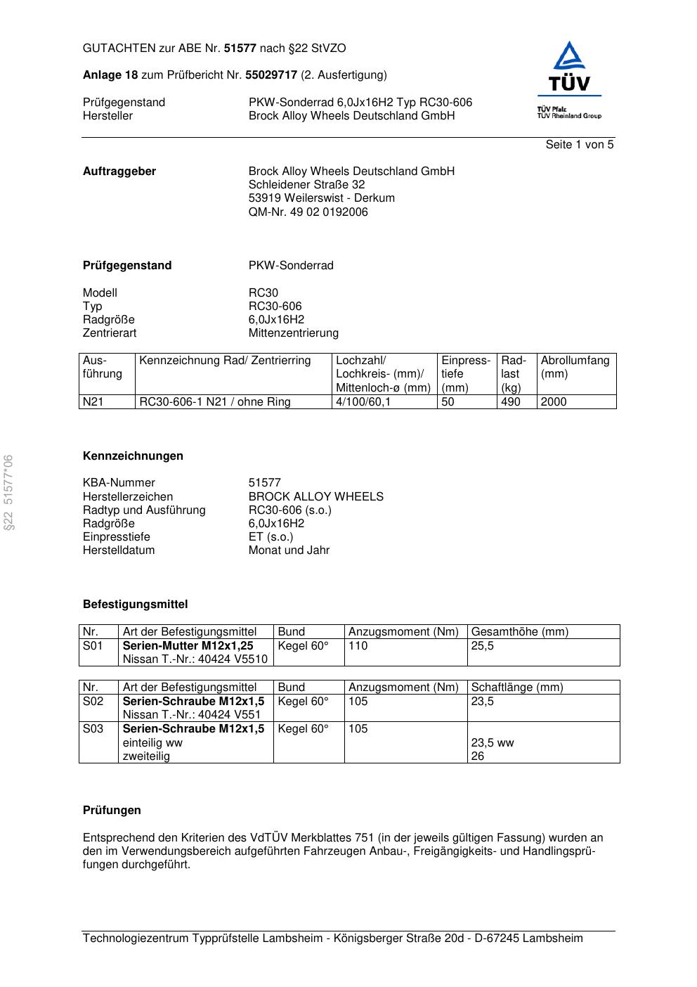 Dieses Gutachten (abe) bezieht sich auf die Alufelge Brock RC30-606 in der Ausführung 6Jx16 ET 0, Mittenloch 0 mm (KBA 51577). Im PDF findest du typischerweise zulässige Reifengrößen, Auflagen/Anbauhinweise und – je nach Dokument – Hinweise zur Eintragung.