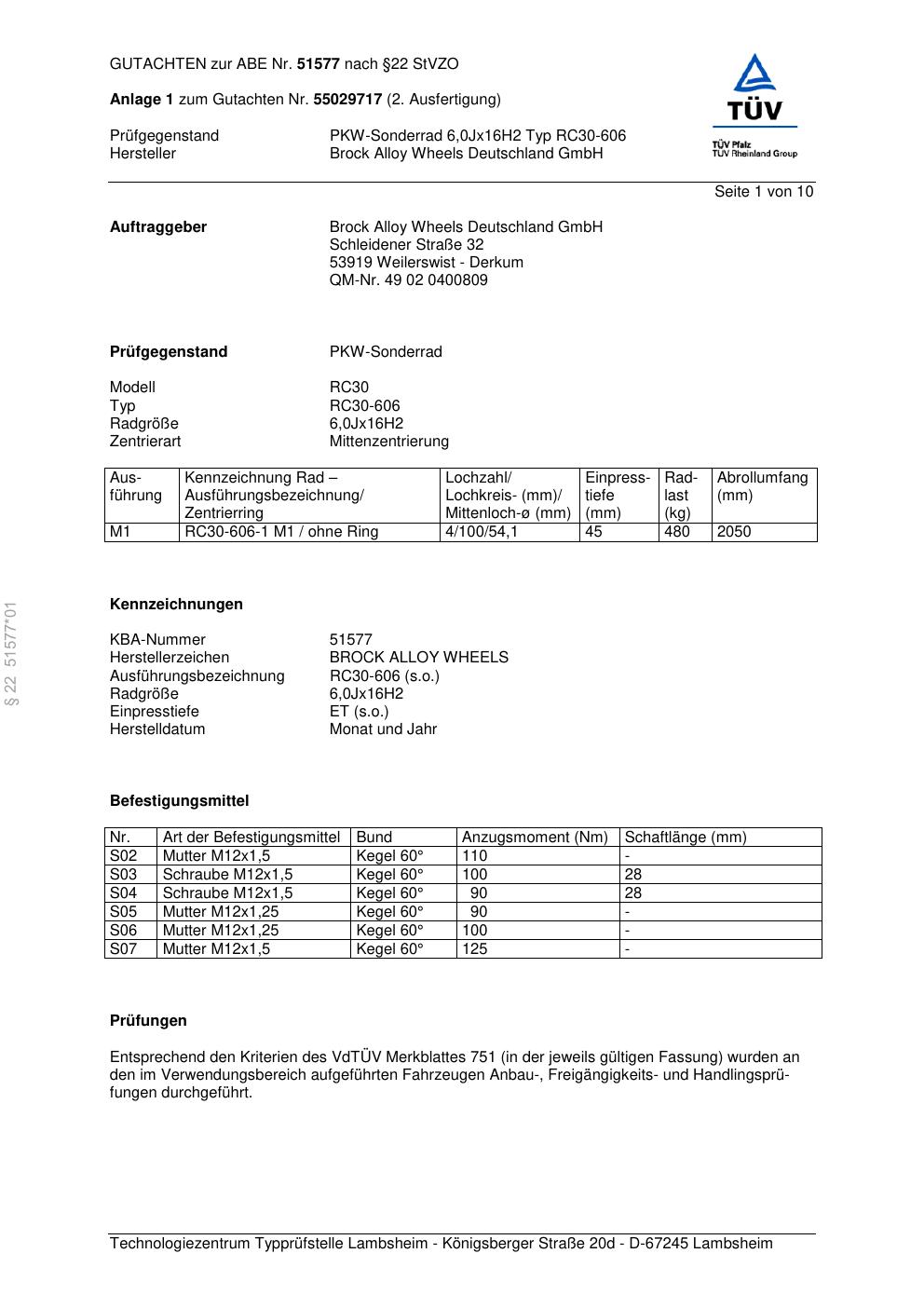 Dieses Gutachten (abe) bezieht sich auf die Alufelge Brock RC30-606 in der Ausführung 6Jx16 ET 0, Mittenloch 0 mm (KBA 51577). Im PDF findest du typischerweise zulässige Reifengrößen, Auflagen/Anbauhinweise und – je nach Dokument – Hinweise zur Eintragung.