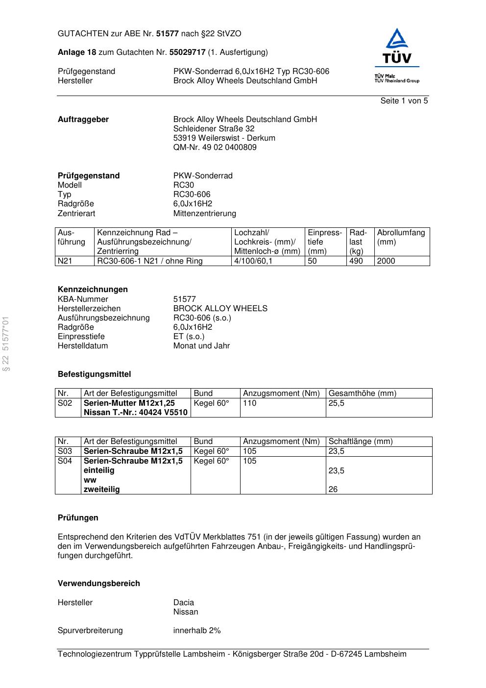 Dieses Gutachten (abe) bezieht sich auf die Alufelge Brock RC30-606 in der Ausführung 6Jx16 ET 0, Mittenloch 0 mm (KBA 51577). Im PDF findest du typischerweise zulässige Reifengrößen, Auflagen/Anbauhinweise und – je nach Dokument – Hinweise zur Eintragung.