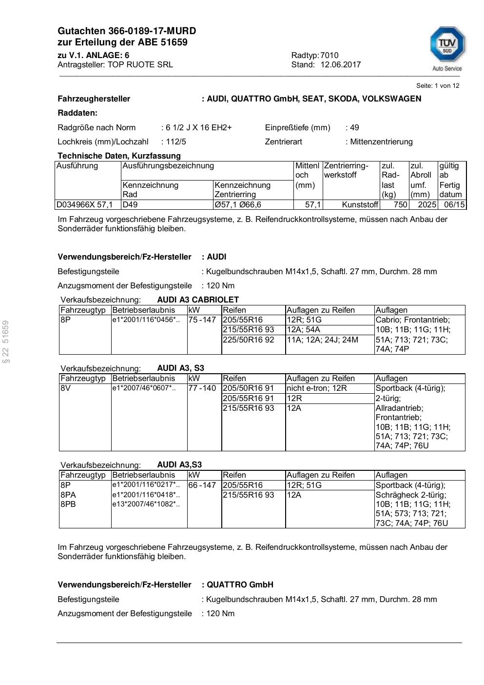 Felgengutachten / abe für Alufelgen ATS 7010 (2Jx16 ET 0, Mittenloch 0 mm) mit KBA 51659 (Zertifikatsnummer 51659). Hier kostenlos als PDF herunterladen. Der Download-Link ist 24 Stunden gültig und kann bis zu zwei Mal verwendet werden.
