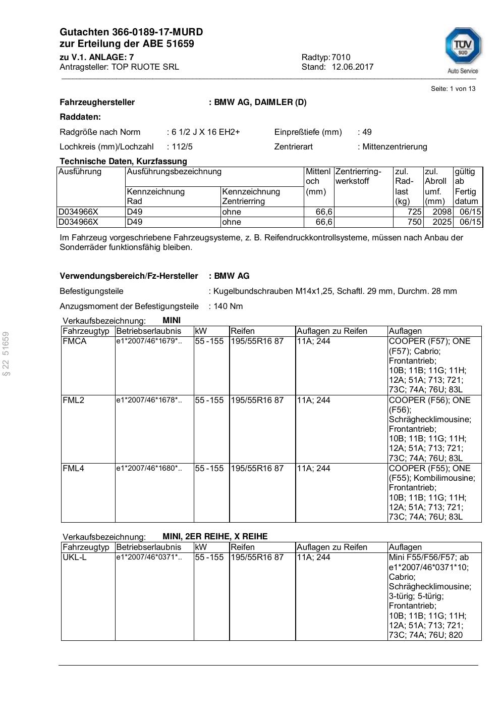 Dieses Gutachten (abe) bezieht sich auf die Alufelge ATS 7010 in der Ausführung 2Jx16 ET 0, Mittenloch 0 mm (KBA 51659). Im PDF findest du typischerweise zulässige Reifengrößen, Auflagen/Anbauhinweise und – je nach Dokument – Hinweise zur Eintragung.
