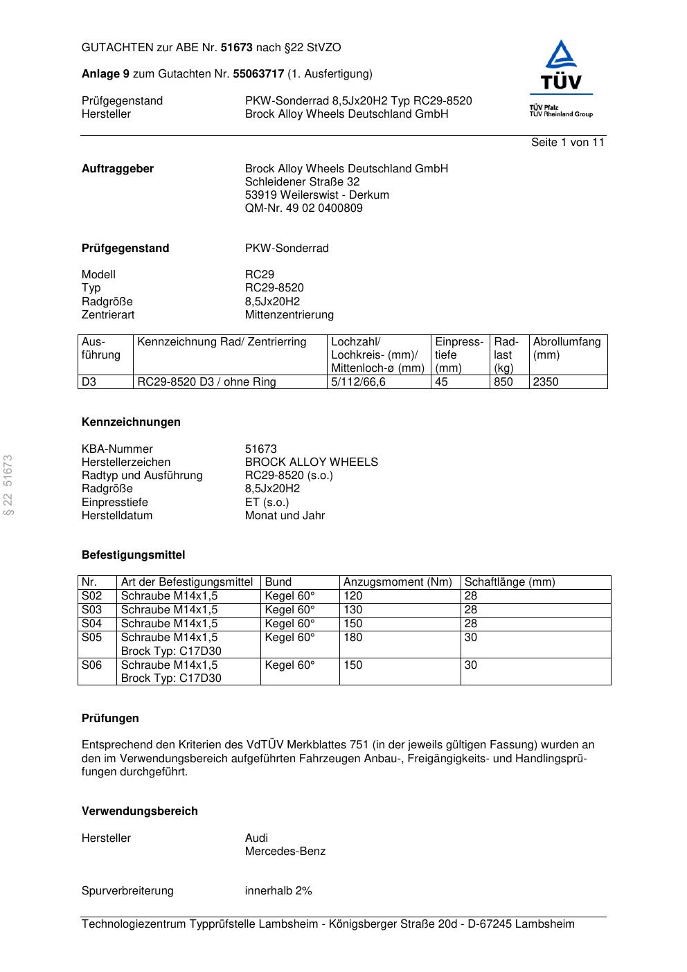 Dieses Gutachten (abe) bezieht sich auf die Alufelge Brock RC29-852 0 in der Ausführung 8.5Jx2 ET 0, Mittenloch 0 mm (KBA 51673). Im PDF findest du typischerweise zulässige Reifengrößen, Auflagen/Anbauhinweise und – je nach Dokument – Hinweise zur Eintragung.