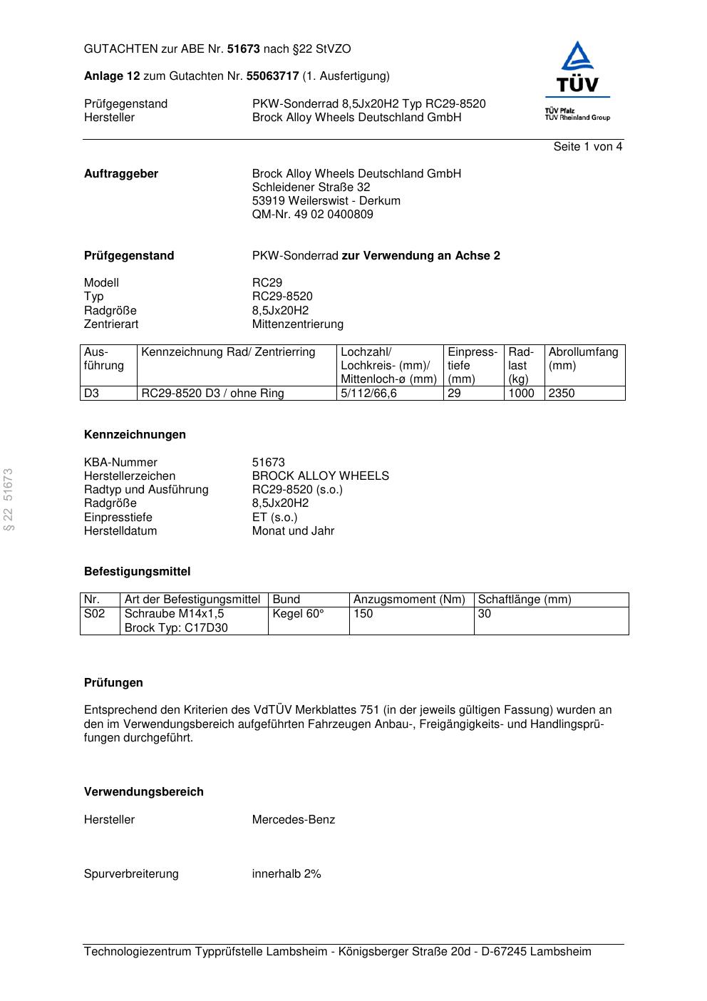 Dieses Gutachten (abe) bezieht sich auf die Alufelge Brock RC29-852 0 in der Ausführung 8.5Jx2 ET 0, Mittenloch 0 mm (KBA 51673). Im PDF findest du typischerweise zulässige Reifengrößen, Auflagen/Anbauhinweise und – je nach Dokument – Hinweise zur Eintragung.