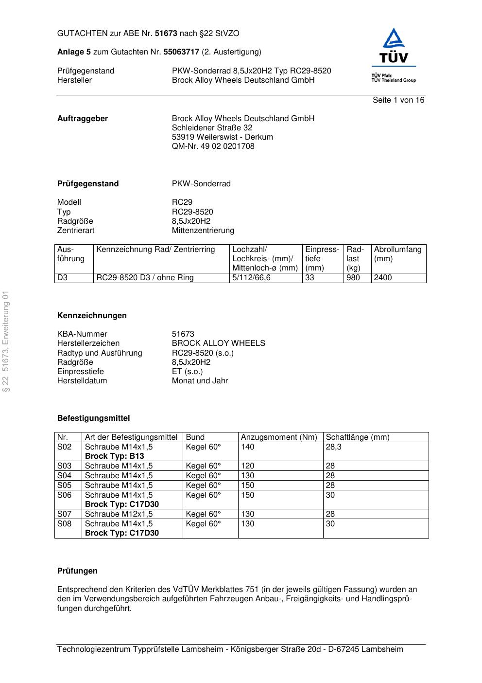 Felgengutachten / abe für Alufelgen Brock RC29-852 0 (8.5Jx2 ET 0, Mittenloch 0 mm) mit KBA 51673 (Zertifikatsnummer 51673). Hier kostenlos als PDF herunterladen. Der Download-Link ist 24 Stunden gültig und kann bis zu zwei Mal verwendet werden.