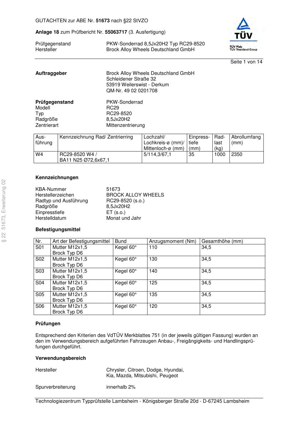 Dieses Gutachten (abe) bezieht sich auf die Alufelge Brock RC29-8520 in der Ausführung 8.5Jx2 ET 0, Mittenloch 0 mm (KBA 51673). Im PDF findest du typischerweise zulässige Reifengrößen, Auflagen/Anbauhinweise und – je nach Dokument – Hinweise zur Eintragung.