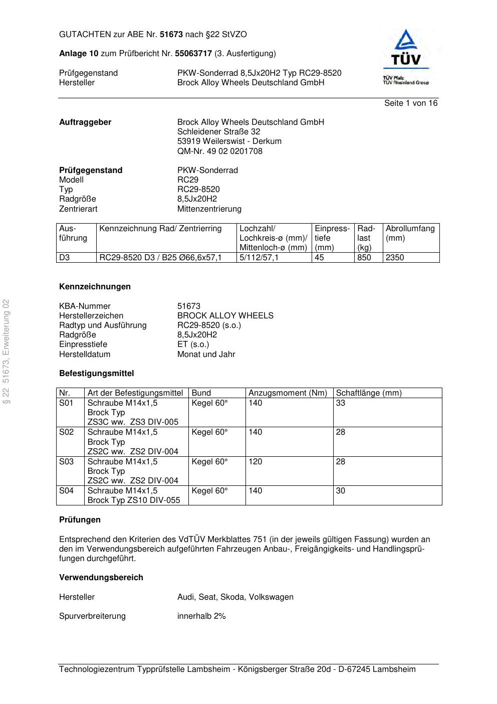 Felgengutachten / abe für Alufelgen Brock RC29-8520 (8.5Jx2 ET 0, Mittenloch 0 mm) mit KBA 51673 (Zertifikatsnummer 51673). Hier kostenlos als PDF herunterladen. Der Download-Link ist 24 Stunden gültig und kann bis zu zwei Mal verwendet werden.