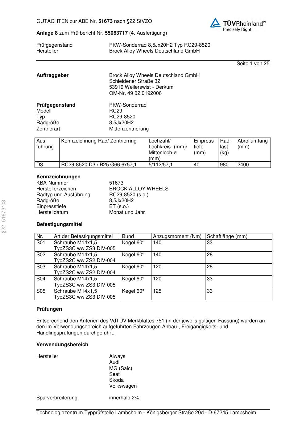 Felgengutachten / abe für Alufelgen Brock RC29-8520 (8.5Jx2 ET 0, Mittenloch 0 mm) mit KBA 51673 (Zertifikatsnummer 51673). Hier kostenlos als PDF herunterladen. Der Download-Link ist 24 Stunden gültig und kann bis zu zwei Mal verwendet werden.