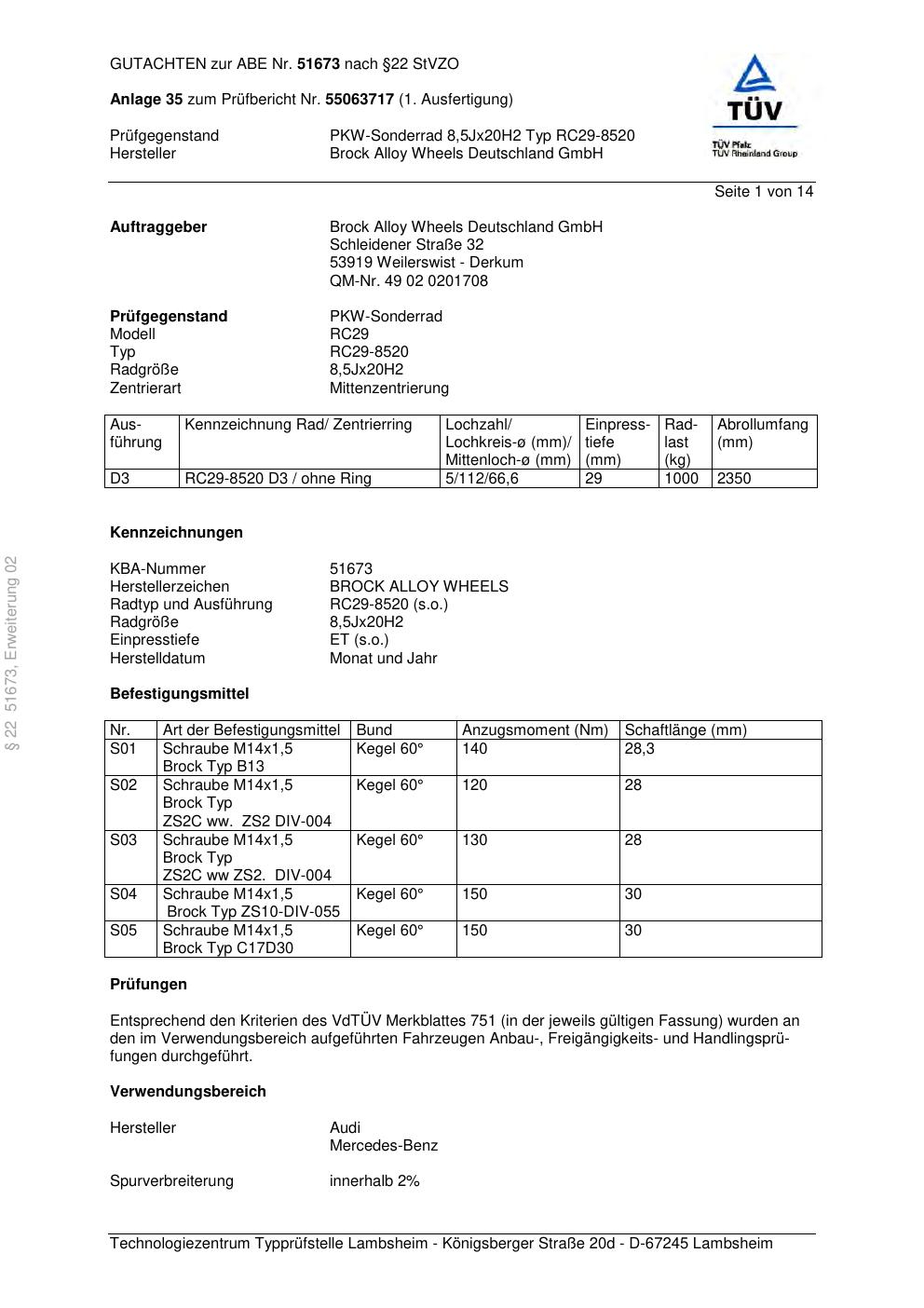 Dieses Gutachten (abe) bezieht sich auf die Alufelge Brock RC29-8520 in der Ausführung 8.5Jx2 ET 0, Mittenloch 0 mm (KBA 51673). Im PDF findest du typischerweise zulässige Reifengrößen, Auflagen/Anbauhinweise und – je nach Dokument – Hinweise zur Eintragung.