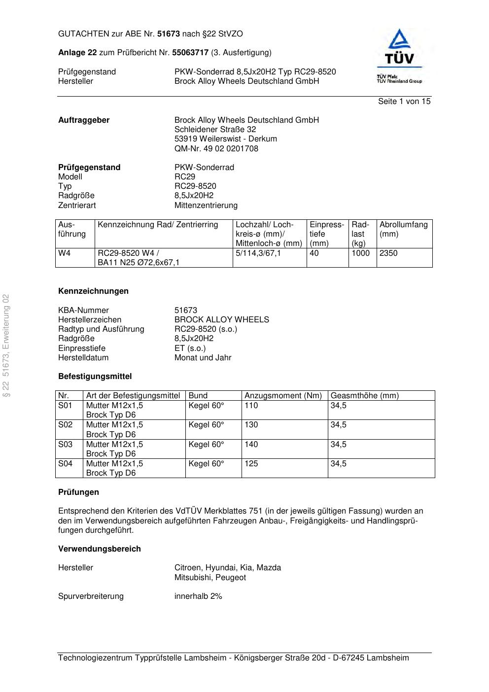 Dieses Gutachten (abe) bezieht sich auf die Alufelge Brock RC29-8520 in der Ausführung 8.5Jx2 ET 0, Mittenloch 0 mm (KBA 51673). Im PDF findest du typischerweise zulässige Reifengrößen, Auflagen/Anbauhinweise und – je nach Dokument – Hinweise zur Eintragung.