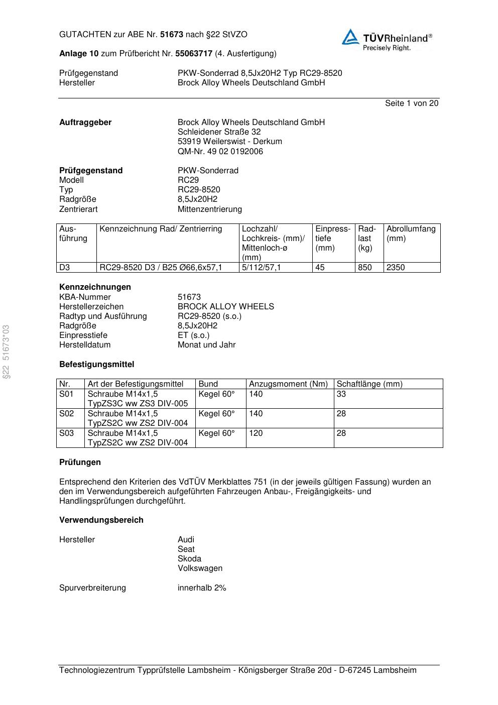 Dieses Gutachten (abe) bezieht sich auf die Alufelge Brock RC29-8520 in der Ausführung 8.5Jx2 ET 0, Mittenloch 0 mm (KBA 51673). Im PDF findest du typischerweise zulässige Reifengrößen, Auflagen/Anbauhinweise und – je nach Dokument – Hinweise zur Eintragung.