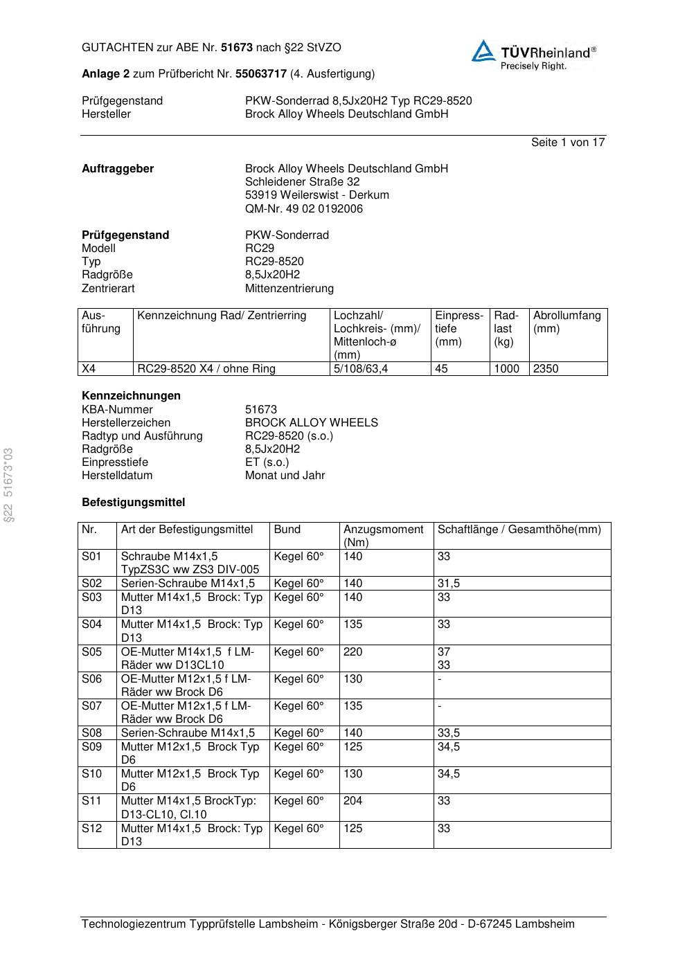 Dieses Gutachten (abe) bezieht sich auf die Alufelge Brock RC29-8520 in der Ausführung 8.5Jx2 ET 0, Mittenloch 0 mm (KBA 51673). Im PDF findest du typischerweise zulässige Reifengrößen, Auflagen/Anbauhinweise und – je nach Dokument – Hinweise zur Eintragung.