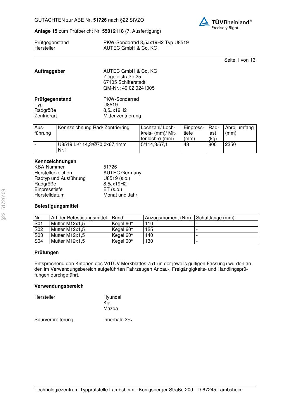 Dieses Gutachten (abe) bezieht sich auf die Alufelge Autec U8519 in der Ausführung 8.5Jx19 ET 0, Mittenloch 0 mm (KBA 51726). Im PDF findest du typischerweise zulässige Reifengrößen, Auflagen/Anbauhinweise und – je nach Dokument – Hinweise zur Eintragung.