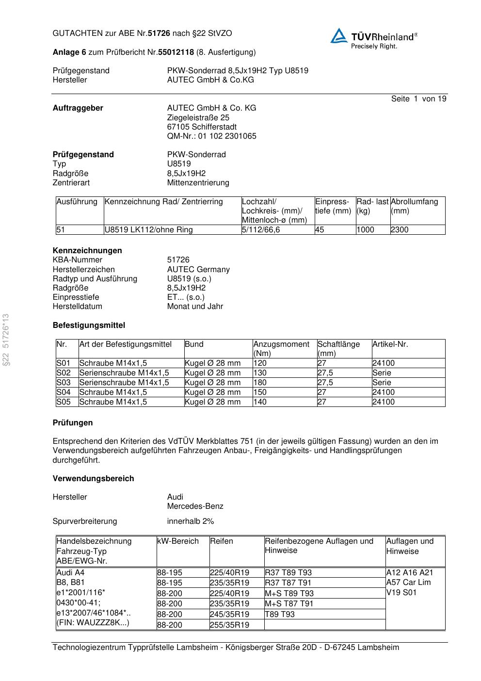 Dieses Gutachten (abe) bezieht sich auf die Alufelge Autec U8519 in der Ausführung 8.5Jx19 ET 0, Mittenloch 0 mm (KBA 51726). Im PDF findest du typischerweise zulässige Reifengrößen, Auflagen/Anbauhinweise und – je nach Dokument – Hinweise zur Eintragung.