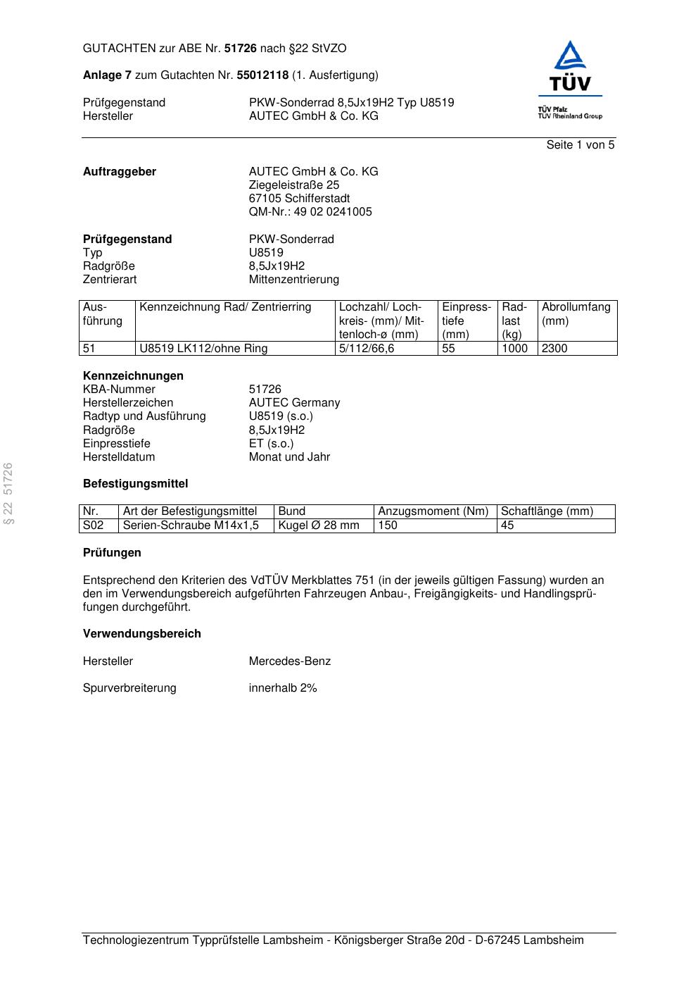 Dieses Gutachten (abe) bezieht sich auf die Alufelge Autec U8519 in der Ausführung 8.5Jx19 ET 0, Mittenloch 0 mm (KBA 51726). Im PDF findest du typischerweise zulässige Reifengrößen, Auflagen/Anbauhinweise und – je nach Dokument – Hinweise zur Eintragung.