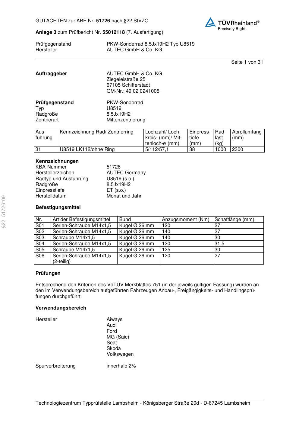 Felgengutachten / abe für Alufelgen Autec U8519 (8.5Jx19 ET 0, Mittenloch 0 mm) mit KBA 51726 (Zertifikatsnummer 51726). Hier kostenlos als PDF herunterladen. Der Download-Link ist 24 Stunden gültig und kann bis zu zwei Mal verwendet werden.