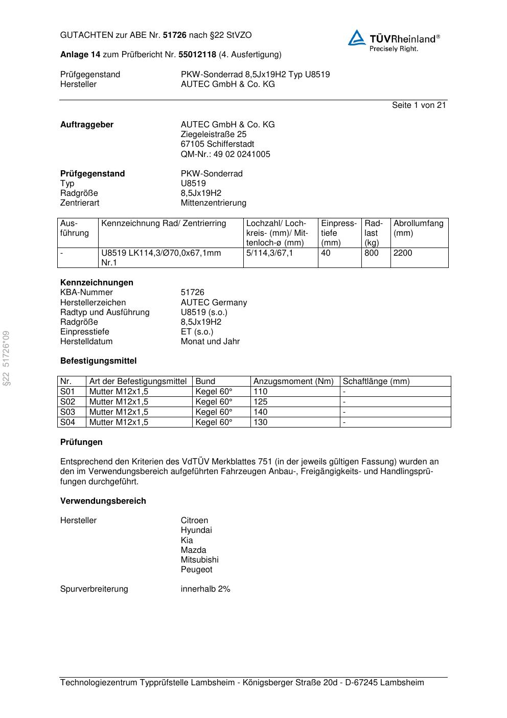 Dieses Gutachten (abe) bezieht sich auf die Alufelge Autec U8519 in der Ausführung 8.5Jx19 ET 0, Mittenloch 0 mm (KBA 51726). Im PDF findest du typischerweise zulässige Reifengrößen, Auflagen/Anbauhinweise und – je nach Dokument – Hinweise zur Eintragung.