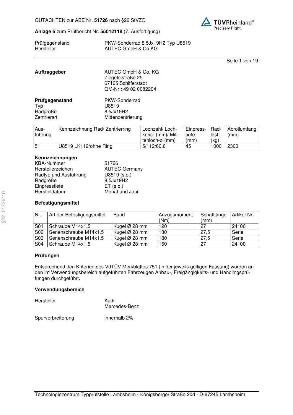 Dieses Gutachten (abe) bezieht sich auf die Alufelge Autec U8519 in der Ausführung 8.5Jx19 ET 0, Mittenloch 0 mm (KBA 51726). Im PDF findest du typischerweise zulässige Reifengrößen, Auflagen/Anbauhinweise und – je nach Dokument – Hinweise zur Eintragung.
