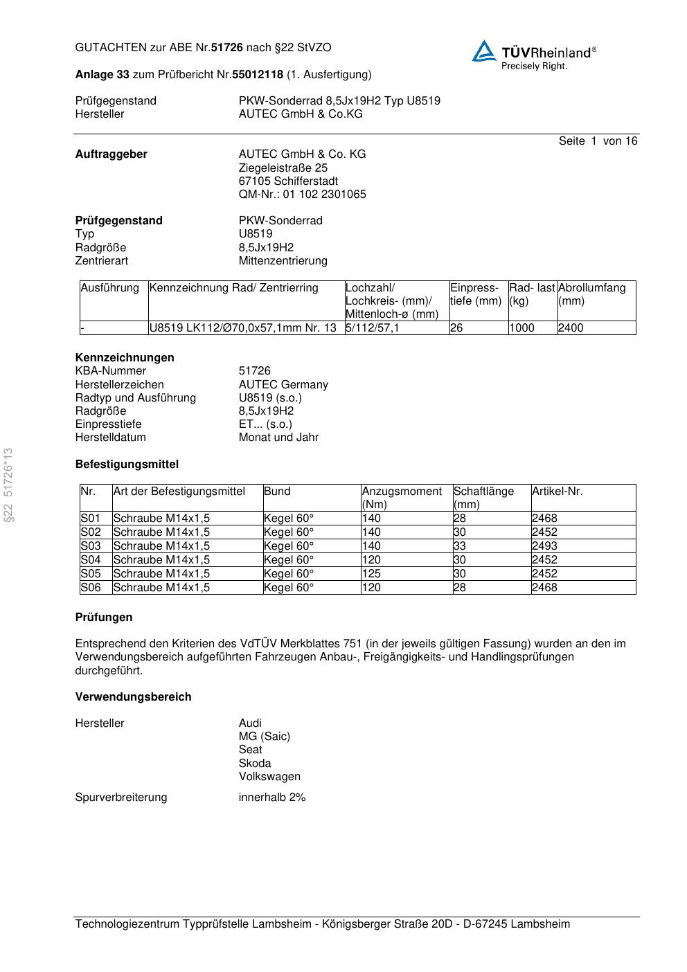 Dieses Gutachten (abe) bezieht sich auf die Alufelge Autec U8519 in der Ausführung 8.5Jx19 ET 0, Mittenloch 0 mm (KBA 51726). Im PDF findest du typischerweise zulässige Reifengrößen, Auflagen/Anbauhinweise und – je nach Dokument – Hinweise zur Eintragung.