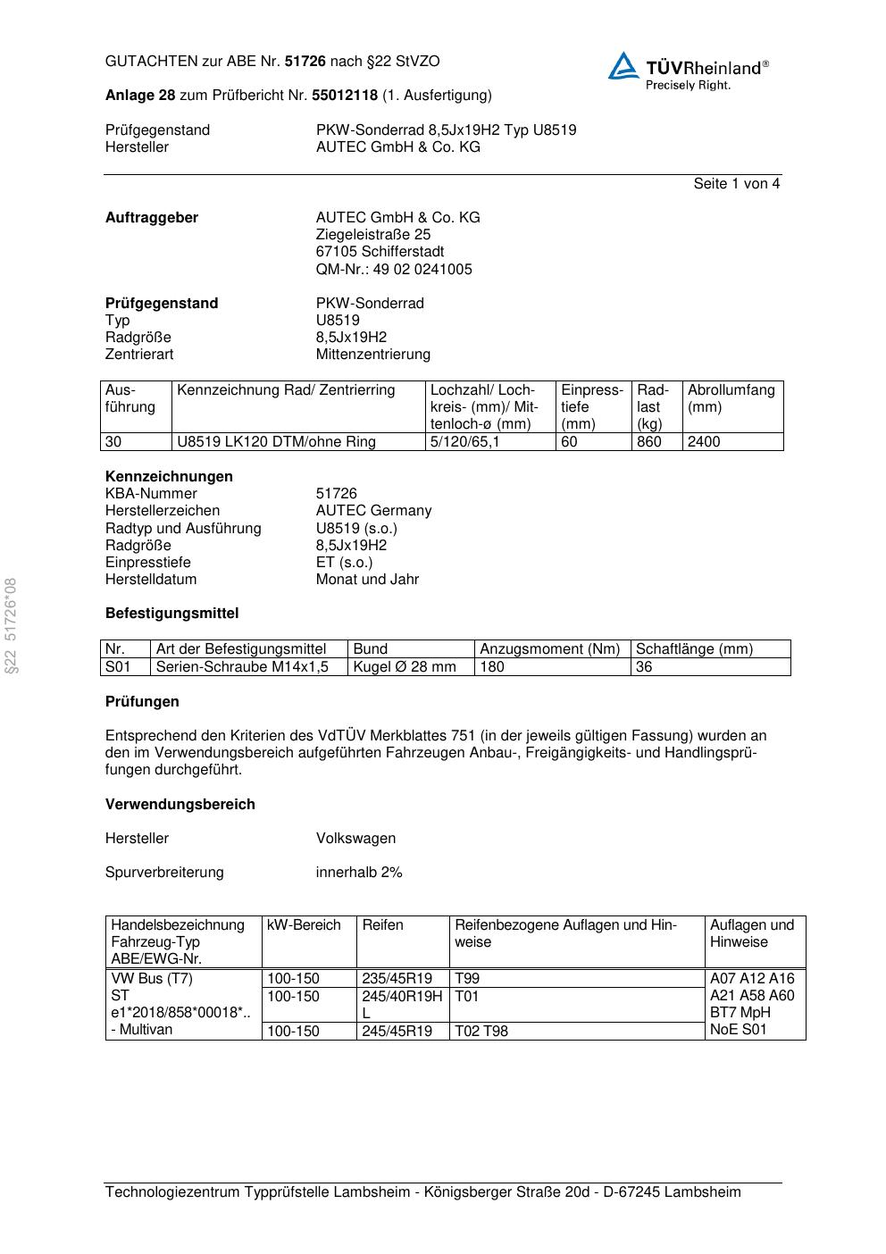 Dieses Gutachten (abe) bezieht sich auf die Alufelge Autec U8519 in der Ausführung 8.5Jx19 ET 0, Mittenloch 0 mm (KBA 51726). Im PDF findest du typischerweise zulässige Reifengrößen, Auflagen/Anbauhinweise und – je nach Dokument – Hinweise zur Eintragung.