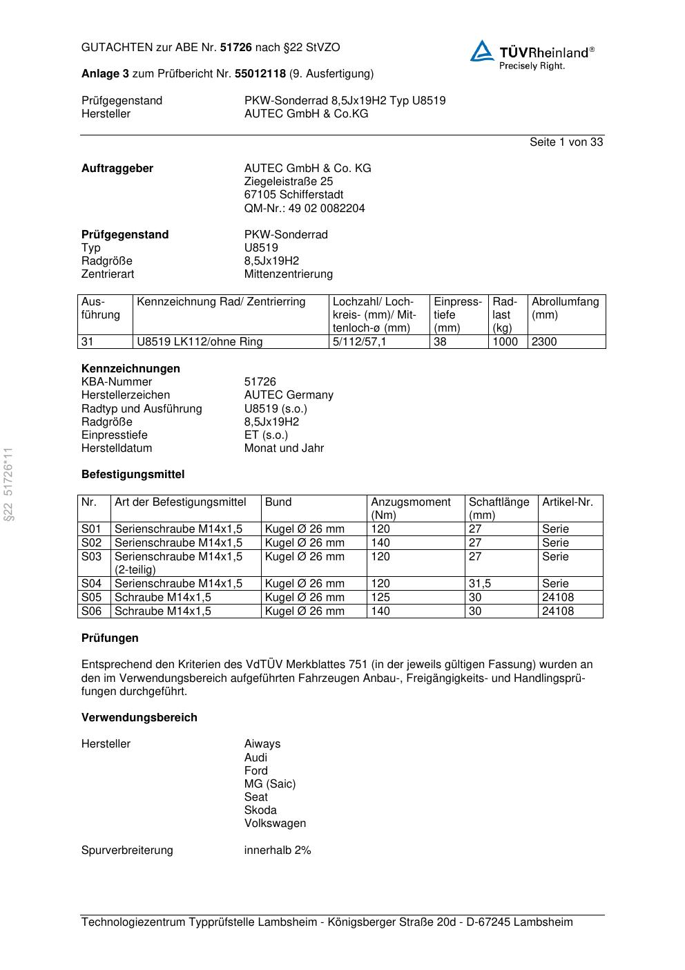Dieses Gutachten (abe) bezieht sich auf die Alufelge Autec U8519 in der Ausführung 8.5Jx19 ET 0, Mittenloch 0 mm (KBA 51726). Im PDF findest du typischerweise zulässige Reifengrößen, Auflagen/Anbauhinweise und – je nach Dokument – Hinweise zur Eintragung.