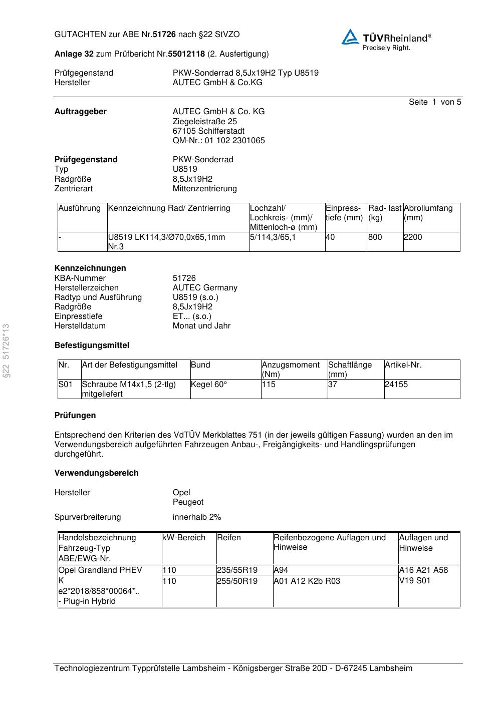 Dieses Gutachten (abe) bezieht sich auf die Alufelge Autec U8519 in der Ausführung 8.5Jx19 ET 0, Mittenloch 0 mm (KBA 51726). Im PDF findest du typischerweise zulässige Reifengrößen, Auflagen/Anbauhinweise und – je nach Dokument – Hinweise zur Eintragung.
