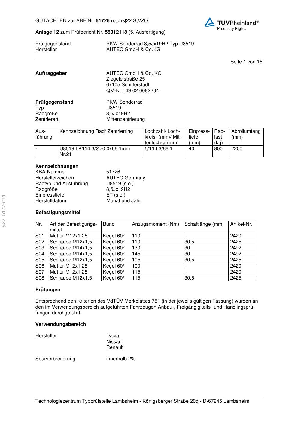 Dieses Gutachten (abe) bezieht sich auf die Alufelge Autec U8519 in der Ausführung 8.5Jx19 ET 0, Mittenloch 0 mm (KBA 51726). Im PDF findest du typischerweise zulässige Reifengrößen, Auflagen/Anbauhinweise und – je nach Dokument – Hinweise zur Eintragung.