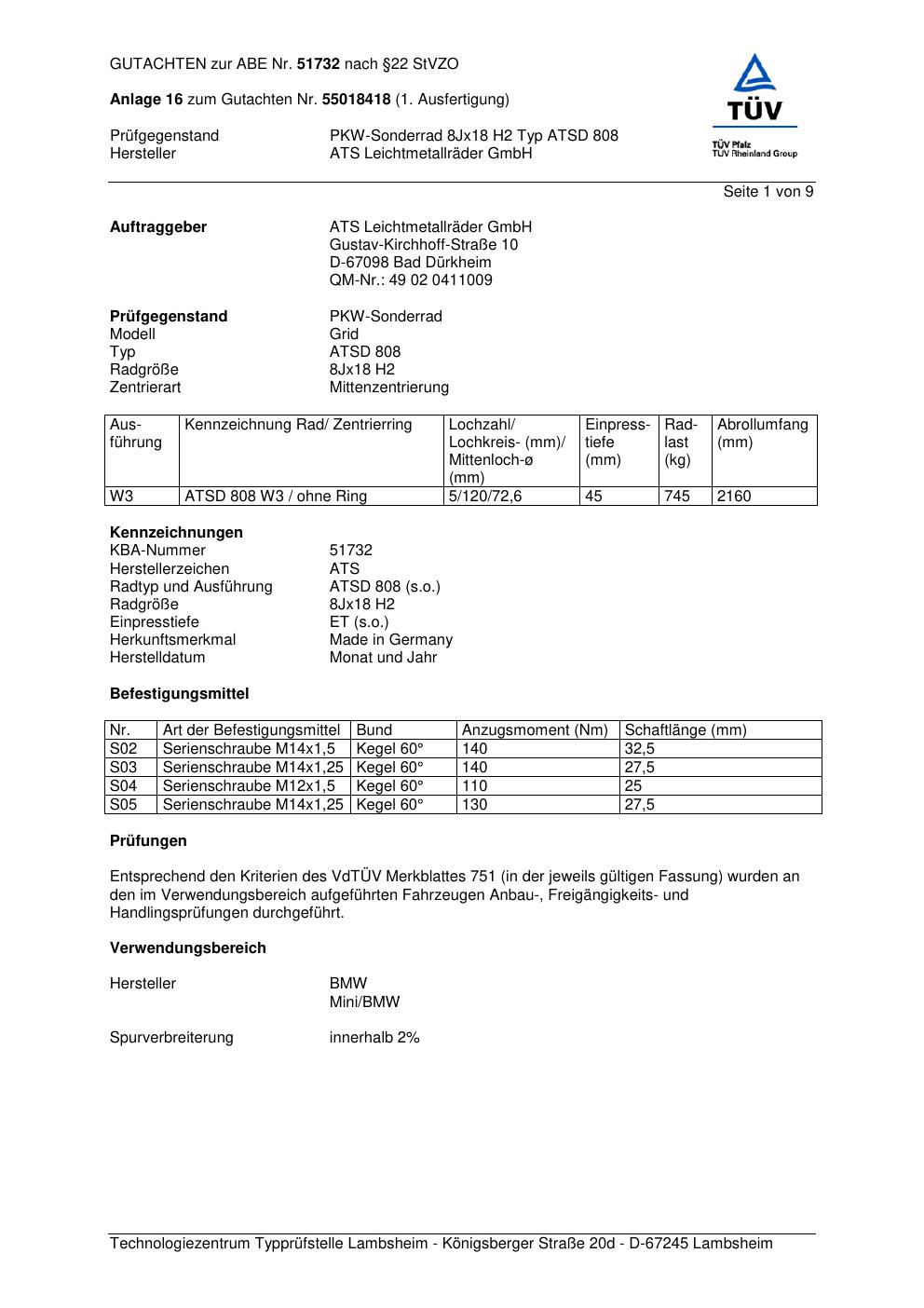 Dieses Gutachten (abe) bezieht sich auf die Alufelge ATS ATSD 808 in der Ausführung 8Jx18 ET 0, Mittenloch 0 mm (KBA 51732). Im PDF findest du typischerweise zulässige Reifengrößen, Auflagen/Anbauhinweise und – je nach Dokument – Hinweise zur Eintragung.
