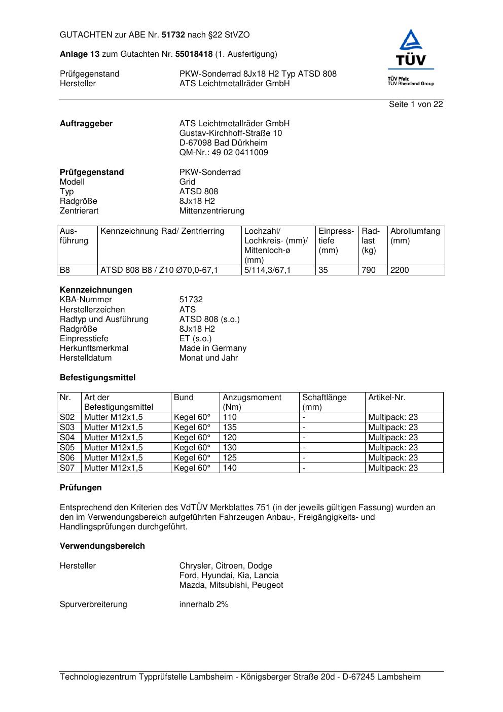 Dieses Gutachten (abe) bezieht sich auf die Alufelge ATS ATSD 808 in der Ausführung 8Jx18 ET 0, Mittenloch 0 mm (KBA 51732). Im PDF findest du typischerweise zulässige Reifengrößen, Auflagen/Anbauhinweise und – je nach Dokument – Hinweise zur Eintragung.