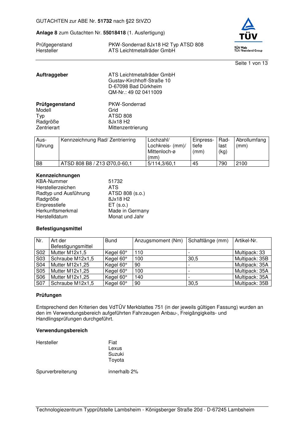 Dieses Gutachten (abe) bezieht sich auf die Alufelge ATS ATSD 808 in der Ausführung 8Jx18 ET 0, Mittenloch 0 mm (KBA 51732). Im PDF findest du typischerweise zulässige Reifengrößen, Auflagen/Anbauhinweise und – je nach Dokument – Hinweise zur Eintragung.
